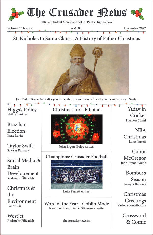 Baljot Rai ’24 Religion & Deputy Editor It is officially the Christmas season: the merriest time of the year! The holiday spirit is in the air, there’s a cheery vibe amongst the students, and Winter Break and presents are on everyone’s minds. However, nothing says Christmas more than the world-famous Santa Claus! The character of... Continue Reading →